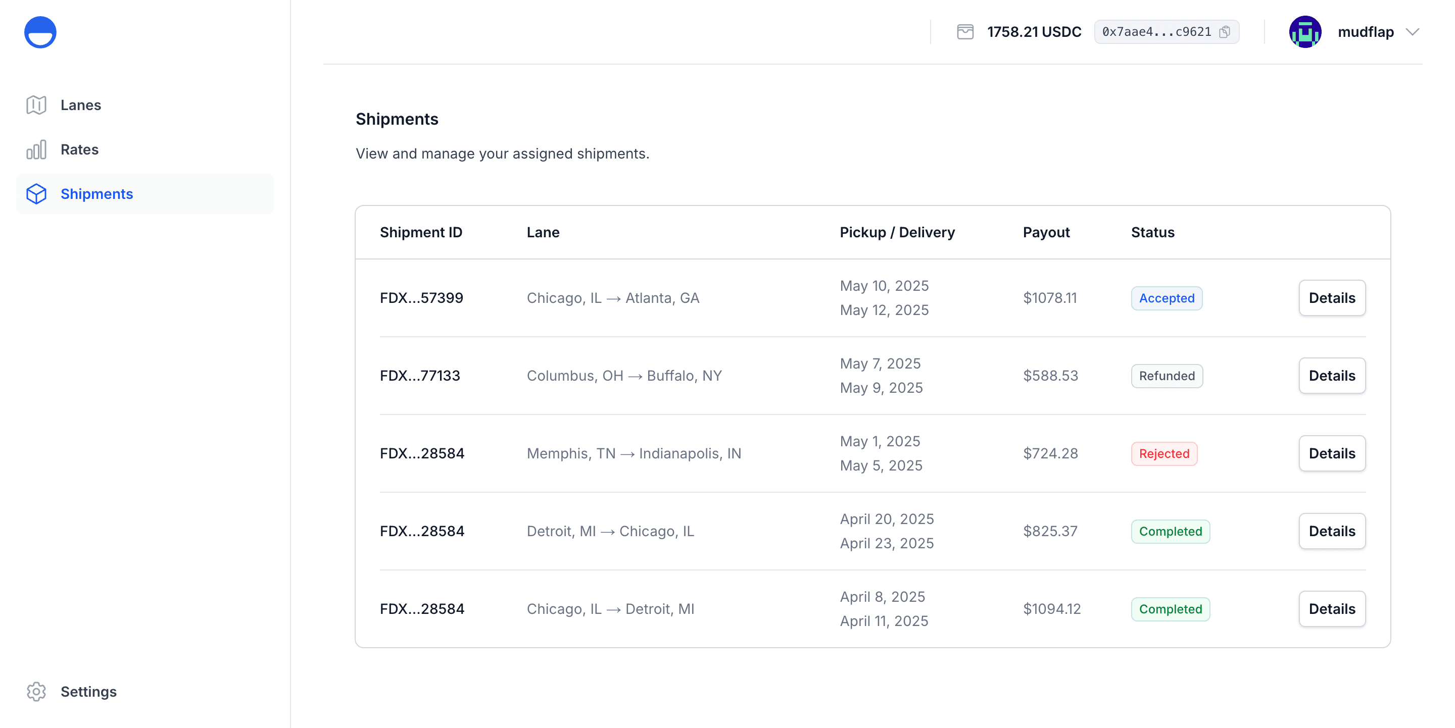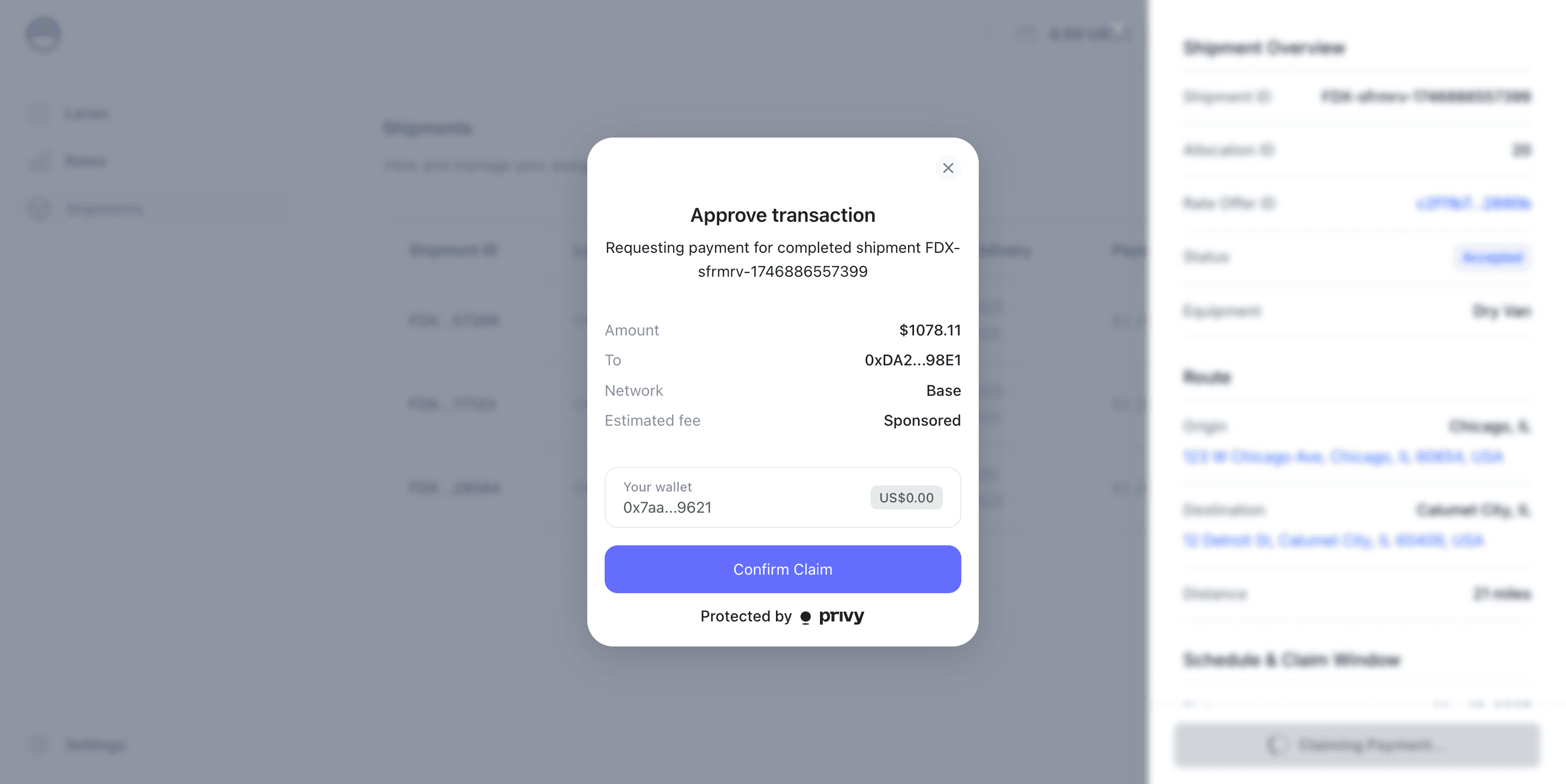 Your payment (in USDC) is locked in a secure smart contract pending carrier acceptance. Once confirmed, funds are only released after the delivery window. This security, combined with avoiding 2-3% card fees, enables more competitive rates.